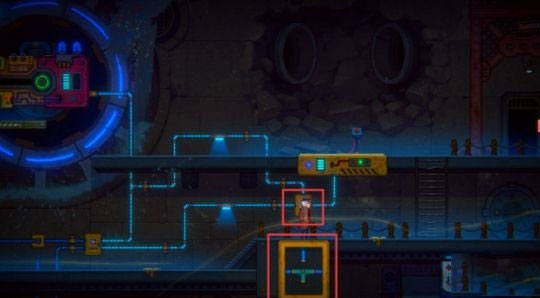 一路往下,按下图转动水车下方的电分流器,使电路与下图中的一致。然后到右侧,按下升降台的红色按钮,升降台浮起。