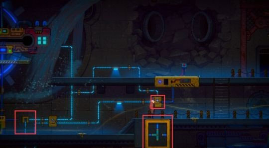 回到水车附近后,调整沿途两个方框中的电分流器,使电路流动与下图一致。最后按下左边的控制台,使水车完全运转。