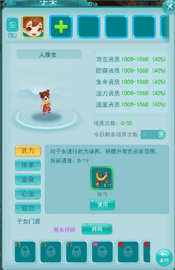 之后可以送孩子去某个门派学习,掌握该门派的一项技能,并且在后续的多次进阶的过程中逐渐掌握另外两项技能。不过请记住,孩子可以拜入的门派跟他的种族有关,所以在选孩子之前就务必规划好,否则迟早会追悔莫及。
