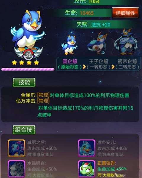 4、并且一般精灵的组合技需要组合加成精灵的星级是一样的,这就好办了,玩家们将每个星级阶段的精灵分开看。小编现在只有两个5星精灵,一眼就能看出皮卡丘和超能萝莉没有加成。然后再看其他星级,4星圆企鹅和大颚蚁生命有加成,那么当你还有其他4星精灵的时候,可以优先让这两个精灵同时上阵。