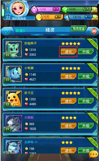 4、精灵进化需要吞噬一张相同星级的精灵卡和大量的金币