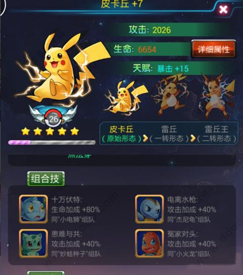 3、在5星精灵中的皮卡丘的组合技,和小电狮组队生命加成,和杰尼龟组队攻击有加成,和妙蛙种子组队有攻击加成,和小火龙组队同样有攻击加成。