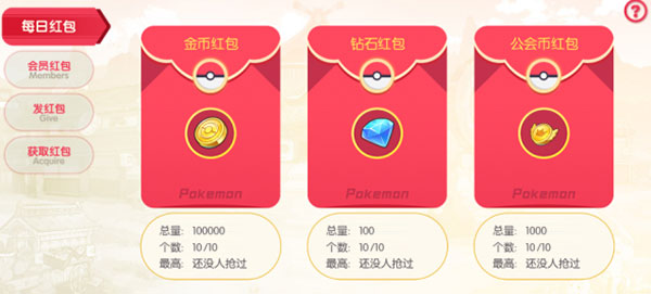 红包:每日19:00系统刷新红包,玩家打开界面后可以抢红包,每个红包只能抢一次哦;
