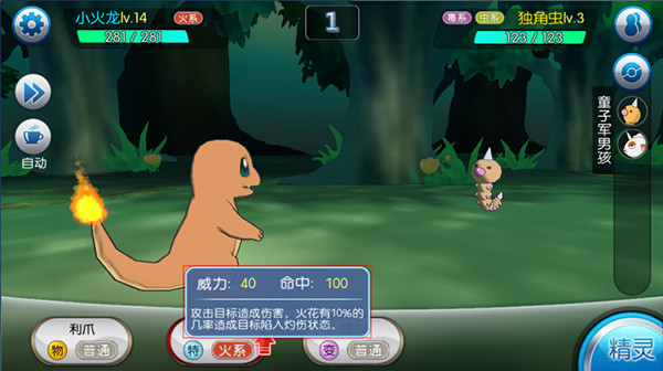 在战斗界面中,精灵习得的技能呈现在屏幕下方,如下图所示: