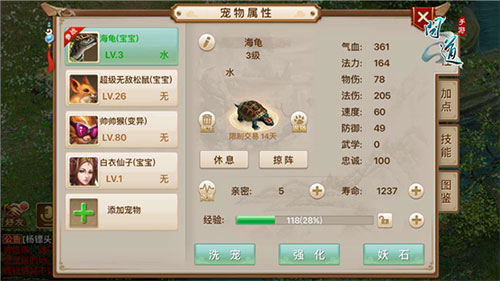 上图的宠物界面中,可以看到宠物能力提升的一些基本操作有:洗宠、强化、妖石、加点、技能。