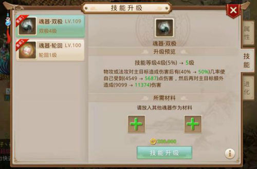 消耗两个副魂器(任意魂器)可以对主魂器进行技能升级,升级有几率失败,失败累积完成度,完成度100%也可以进行升级。魂器生效百分比和生效伤害或者增加气血数值随技能等级增加而增加。升级失败时每个技能等级累积的完成度如下: