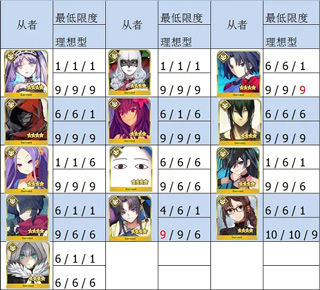这里的等级推荐主要参考自appmedia的等级推荐,根据自身的体感,也对一些从者的等级推荐进行了修改,做出了以下表格,每个从者都有两个推荐数据,一个是可以使用的最低限度,一个是比较理想的强化情况,红字部分是适合升到10级的技能,不过由于从者多结晶少,所以还是得根据自身的情况来考虑。