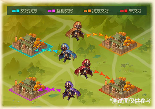 玩法中不同的颜色表示不同的交好关系。蓝——本军团、青——交好我方、紫——相互交好、橙——我方交好、红——未交好。