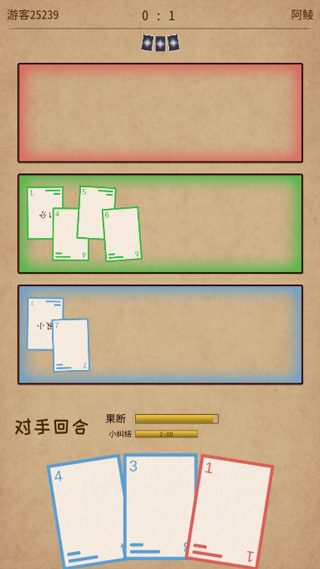 每轮双方从牌库抽6张手牌,全部打完后结束一轮,结算场上打出的卡牌“张数”(而不是牌面的数字),较多者获得一轮胜利,之后开始下一轮。