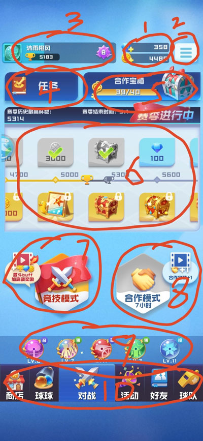 (10)仔细看的同学就会发现,我的图片中并没有10,因为我也不知道怎么标注,10是对战的奖励和惩罚,赢了加10经验,输了扣8,输赢±奖杯数在30/40之间随机,领了激斗buff以后,胜利额外获得70奖杯数和300多金币,10以内的钻石,