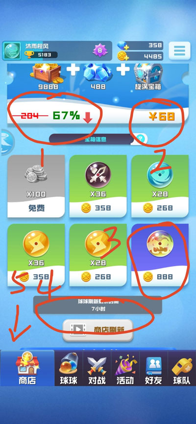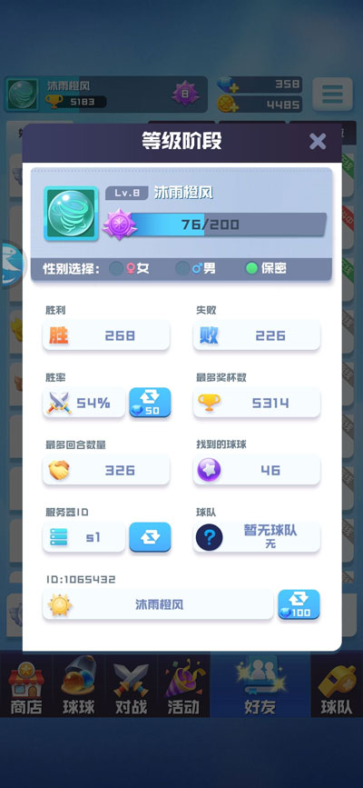 12、这个游戏比较常用的各个界面,有商店,球球,主页,好友,活动,球队。六个界面。