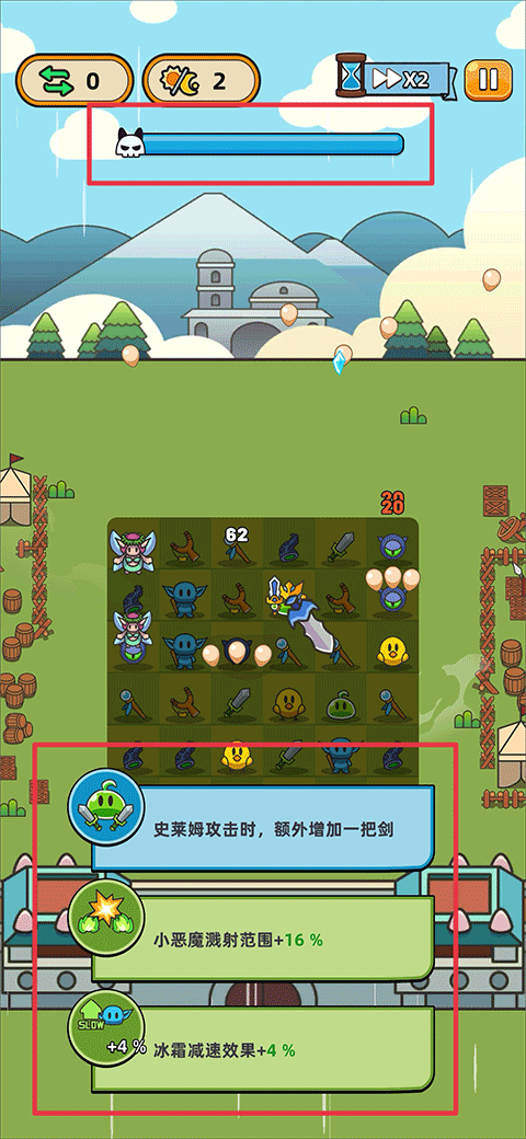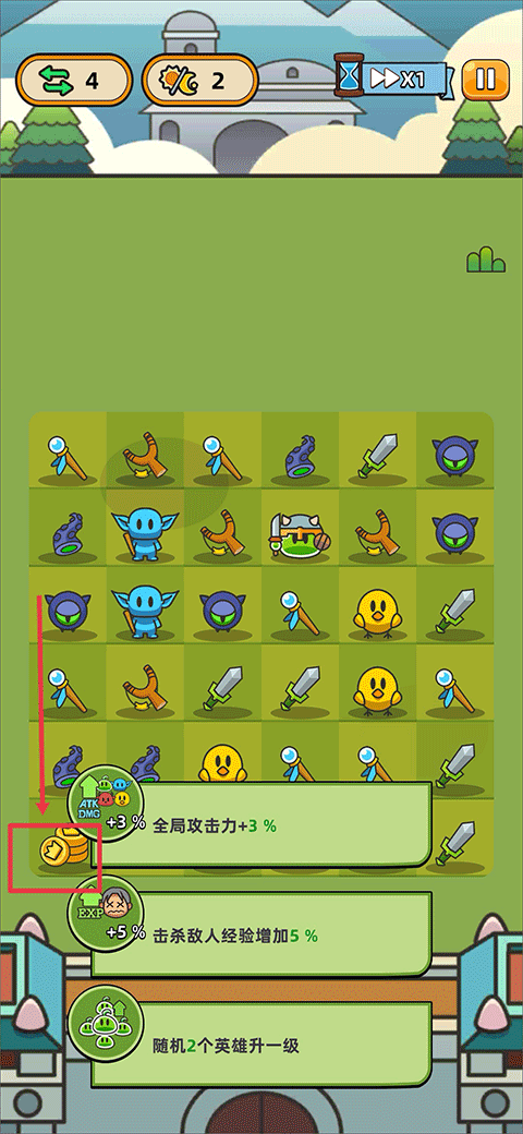5、我方英雄在成功抵挡出现的敌人后会获得分数,当上方进度条满时同样可以解锁技能选择功能