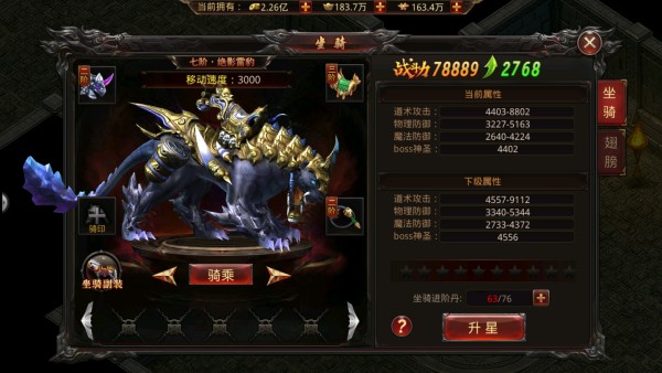 可以对坐骑和翅膀装备进行升星,提升角色战斗力属性。