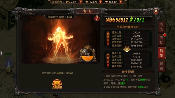 转生系统可查看转生等级和转生后升级属性。