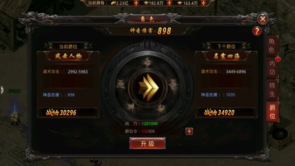 可查看角色信息、爵位等级、转生等级、内功等级等信息。