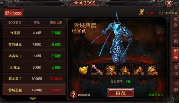 挑战BOSS中包含地宫、神殿、野外、经验、雪域五个部分。其中地宫包含神殿BOSS、专属BOSS、转生BOSS、秘境BOSS、魔化BOSS。