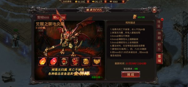 当转生BOSS、秘境BOSS、魔化BOSS、野外BOSS、雪域BOSS出现后,玩家可以进入相应地图寻找BOSS,打败后可以获得BOSS遗留的宝物。