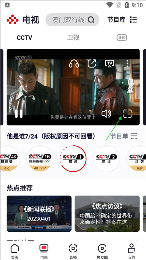 横屏观看方式其实在央视频直播中就是以全屏方式观看,当直播画面进入全屏模式后,播放画面就会自动横屏,其操作方式也很简单,只需要用户进入直播页面后,点击直播画面就会在其右下角位置出现全屏图标(下图绿色箭头所指)