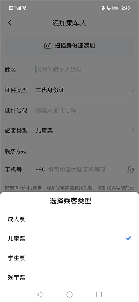 6、最后在添加乘车人当中填写好姓名、证件号码、旅客类型(这里可以选择成人票、儿童票、学生票和残军票)、手机号后点击添加,即可完成添加。