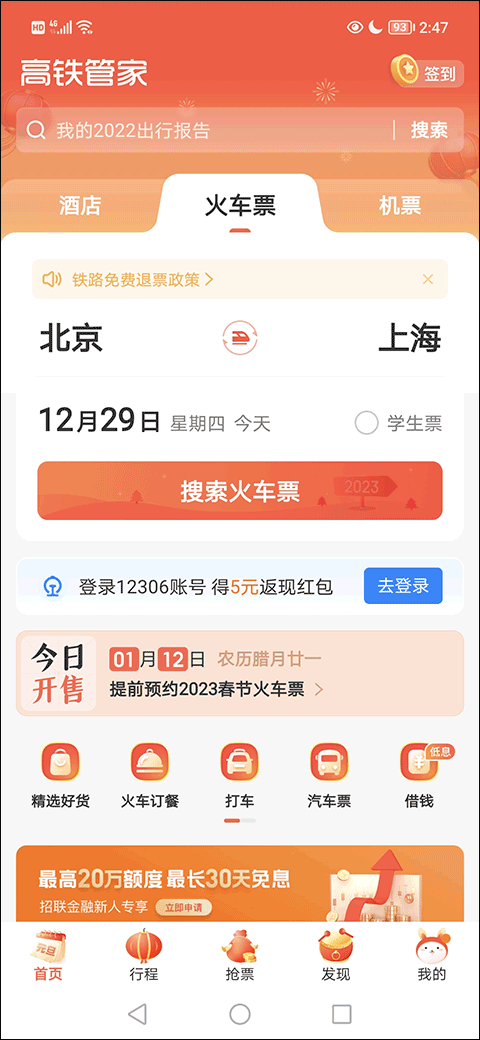 对于一个经常需要坐火车的用户,一款好用的软件的可以非常方便的用户们的出行,小编这里推荐给大家使用高铁管家手机版,这是一款功能非常强大的手机在线订票软件,有了这款软件用户们不但可以轻松一键预订和查询高铁车票,还能够直接连接12306购买火车票,非常的方便实用。