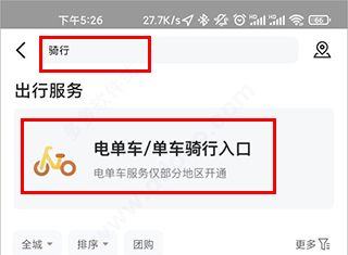 1、在手机中打开美团APP,进入界面,点击上方的【骑车】功能,当然找不到的也可以直接在搜索框中输入“骑行”接着即可看到美团电动车骑行入口