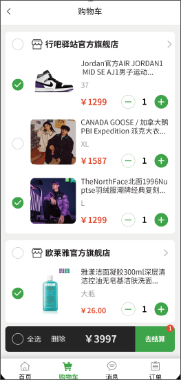 用户可在此页面查看所有已添加到购物车内的商品,可查看信息包括商品所属店铺、价格及数量。单选或全选商品,对选中商品进行从购物车删除或结算操作