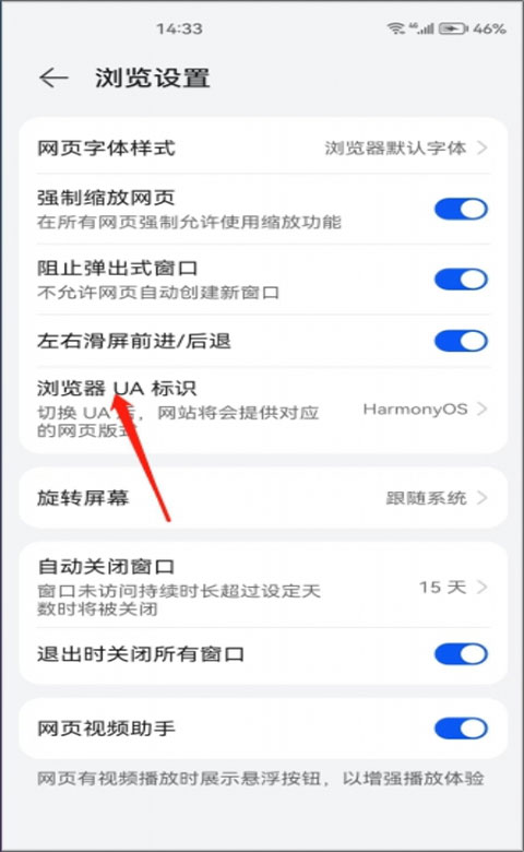 3、在浏览设置页面点击浏览器UA标识;