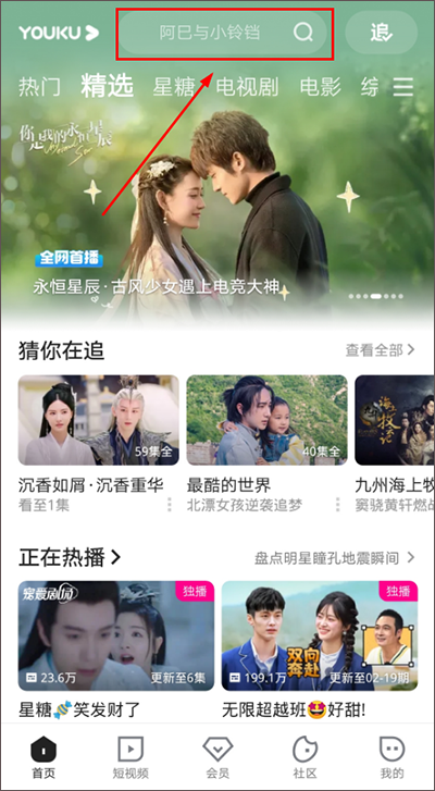 1、打开登录优酷视频app,点击首页内的搜索栏,查找想要观看的电视剧;