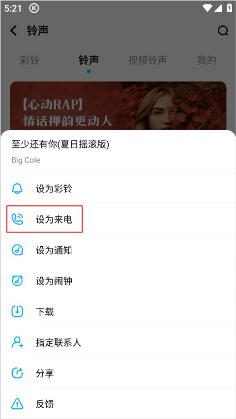 3、其中铃声选择需要点击竖着三个点的下拉菜单,找到“设为来电”。