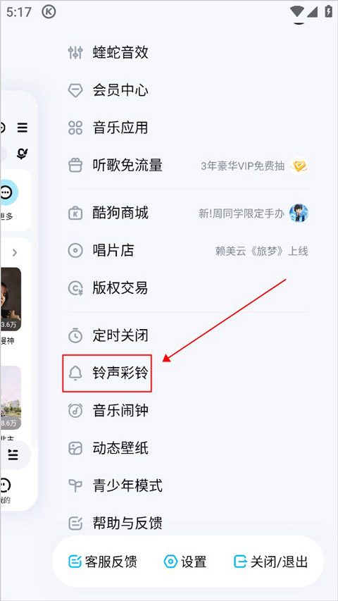 1、打开酷狗音乐,点击右上角的下拉菜单,找到“铃声彩铃”。