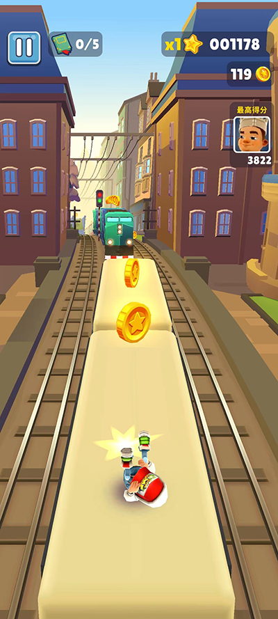 滑板:通过双击屏幕来启动滑板,滑板会持续一段时间。在没有滑板的情况下,角色撞到火车或者障碍等都会被抓住,导致游戏结束。但在有滑板的状态下,角色就有了一道保险,撞到火车等的时候,滑板会消失,游戏可以继续进行。