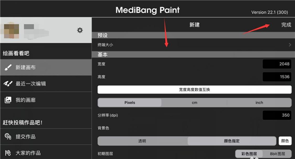 3、进入新建后,可以更改大小、背景色、分辨率,确定好后,点击完成。