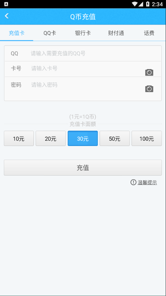 2、点开第一个Q币充值,输入自己的QQ号,下面的卡号可以使用相机一键拍摄提取即可(注意:一元=1Q币)