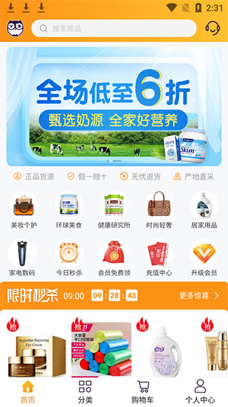 美妆个护、环球美食、健康研究所、时尚轻奢、居家用品、家电数码、今日秒杀、会员免费领、充值中心、升级会员
