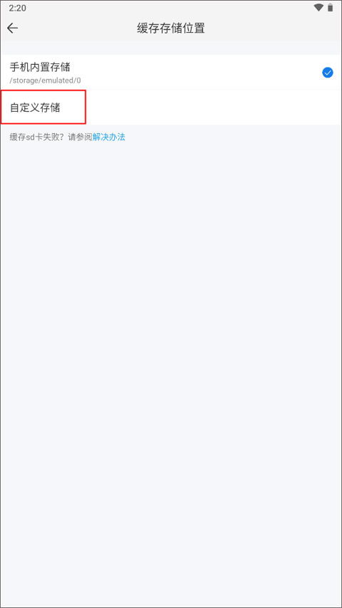 3、它默认的存储位置是手机内置存储路径,点击自定义存储。