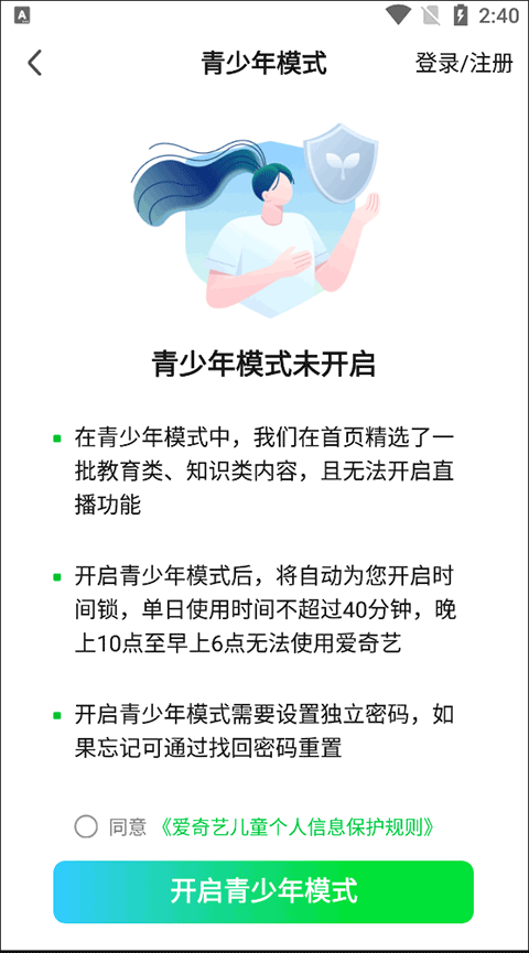 3、在青少年模式中点亮“同意爱奇艺儿童个人信息保护规则”后找到并点击“开启青少年模式”选项;