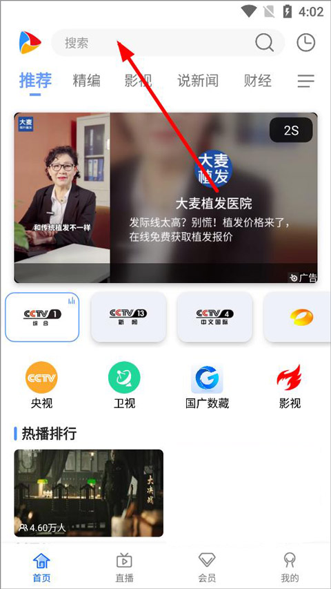 1、打开dopool手机电视安卓版,登录进入首页,首页有央视频道、地方卫视、国广数藏、影视等栏目,用户可以在搜索框输入剧名搜索视频;