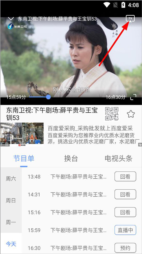 3、点击视频右上角“TV”图标,选择需要投屏的设备(智能电视或网络盒子),确保智能电视、手机在同一wifi下,点击投屏即可。