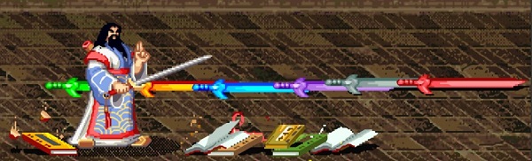 倚天剑(火剑):第一关双人洞持剑人物打开箱子。第五关火烧连营场景3分50秒内见到并撞沙摩柯10下