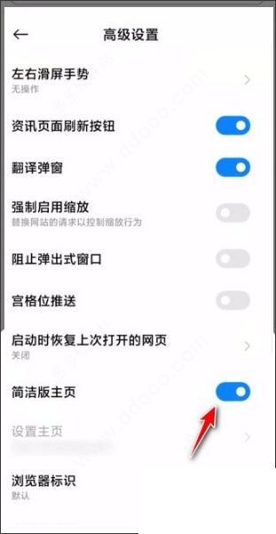 6、完成以上所有步骤后,我们在页面上就可以看到“简洁版主页”选项,点击该选项后面的开关按钮使其处于打开状态,就成功将浏览器主页设置成简洁版了。