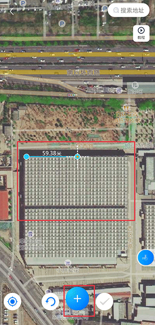 3、再地图上找到并放大需要测量的区域,并使用中间蓝色+号在测量区域周围点一圈