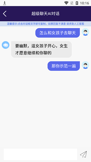 1、全新ai代聊,输入话题,即可获得有趣回复2、恋爱话术,只需复制粘贴,就能把ta聊的小鹿乱撞