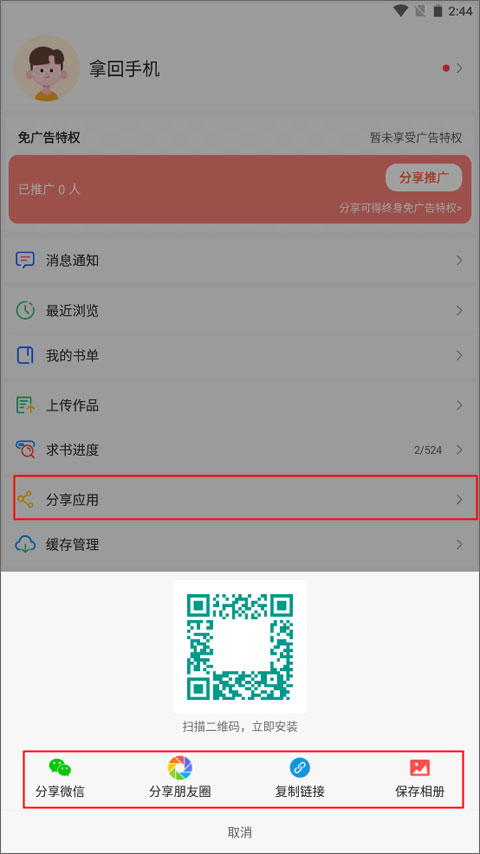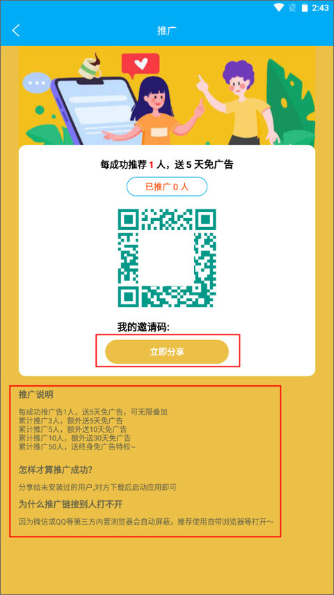2、当你推广达到一定数量就可以获得永久免广告的特权,用二维码扫描进行下载就能成功推荐1人了。