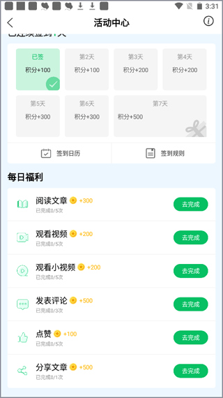 每日签到活动,每天登录app并完成签到,即可获得相应的金币奖励;如中断则从第一天开始重新计算。