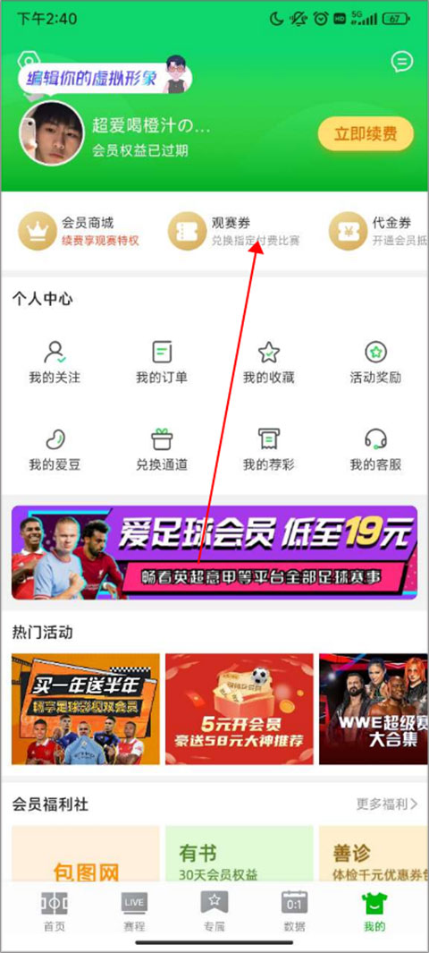 购买体育会员成功后可获赠观赛券(2张),获赠的观赛券会即时发送至您的会员账户中。您可以进入“我的”-“观赛券”(手机)或“我的账户”-“账户信息”(电脑)中查看。