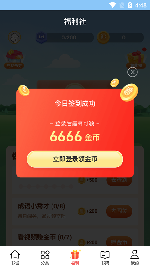 2、进入“福利社”之后,有一个签到,这个是可以获得金币的,但是需要登录该应用哦。