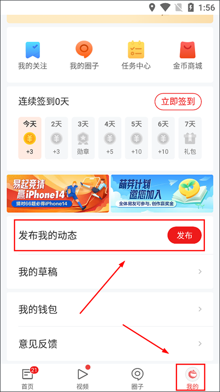 打开登录网易新闻app--点击下方【我的】--在【我的】页面中选择【发布我的动态】。