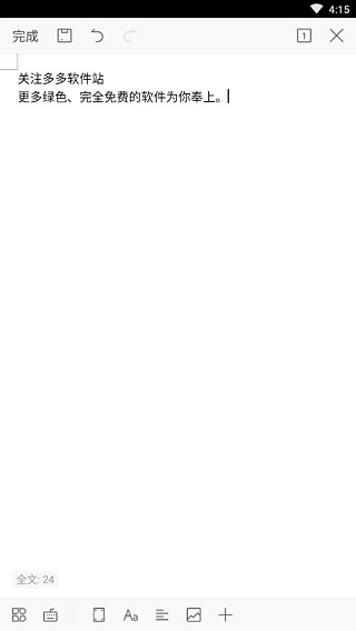 新建文档进入后,点击光标的位置开始打字即可,在界面的下方还有更多使用功能,如字号、字体的选择、加粗、倾斜、下划线和字体颜色、高亮显示、多倍行距,文字居中的方式等等,其他的更多使用需求,如同电脑端的WORD操作类似,这里小编就不一一赘述了。