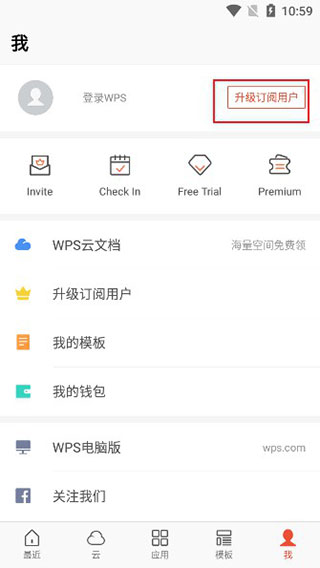 3、退回到我的界面中,选择登录WPS,输入邮箱、密码即可进行登录;