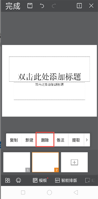 打开PPT文档进入编辑模式后,长按下方需要删除的幻灯片缩略图,在菜单中选择「删除」图标,即可删除选中的幻灯片